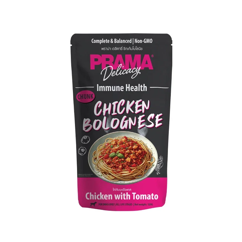 A wholesome and delicious meal made with real chicken and tomatoes, inspired by the classic Bolognese recipe. This complete and balanced food supports your dog’s immune health while providing essential vitamins and minerals for overall wellness. With tender chicken chunks in savory gravy, it’s perfect for adult dogs; even picky eaters will love it! Made with non-GMO ingredients for safe, natural nourishment.
