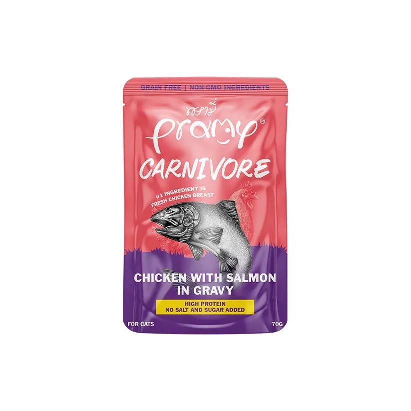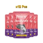 Carnivore Chicken & Salmon in Gravy features tender chicken breast and real salmon, served in a savory gravy that’s packed with flavor and nutrition. With a minimum of 11% high-quality protein, it supports strong muscles and healthy development for kittens, adults, and seniors alike. Enriched with taurine, fish oil, FOS, and vitamin E for cats of every age.
