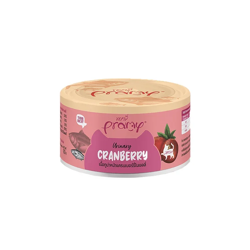 Pramy Urinary tuna meat topping cranberry in jelly is a premium wet cat food specifically formulated to support optimal urinary tract health. We use high-quality, human-grade tuna and incorporate the natural benefits of cranberries, which are known to help prevent bacteria from adhering to the bladder wall. The hydrating jelly format ensures your cat receives essential moisture, aiding in urine dilution and reducing the risk of crystal formation. This recipe is ideal for cats of all ages and is a delicious way to support their overall well-being.